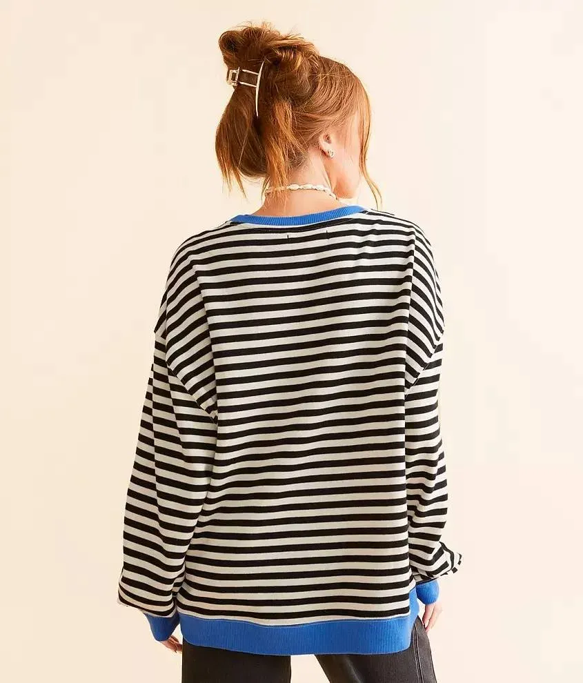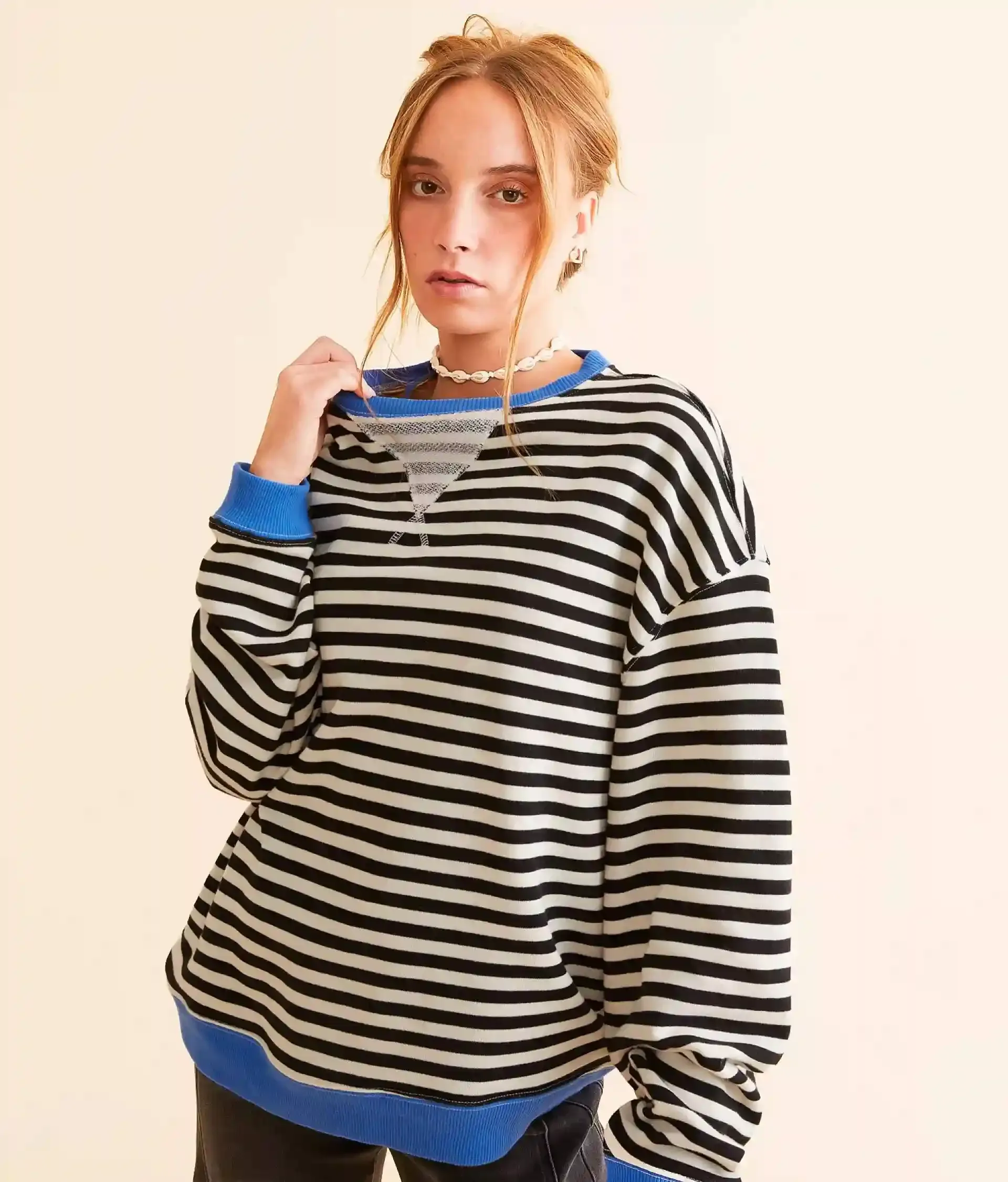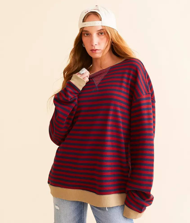 Our Striped French Terry Sweatshirt combines timeless athletic details with a contemporary oversized silhouette. The standout feature is the contrast ribbing at the neckline, cuffs, and hem, paired with a traditional V-stitch insert that adds a vintage varsity feel. Designed with a drop-shoulder cut, it provides a relaxed, effortless drape that appeals to modern fashion-forward consumers.